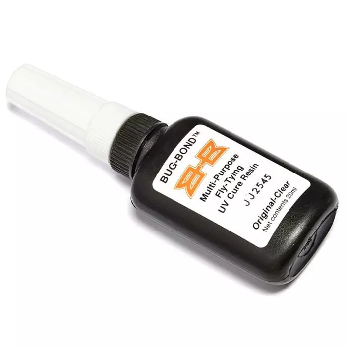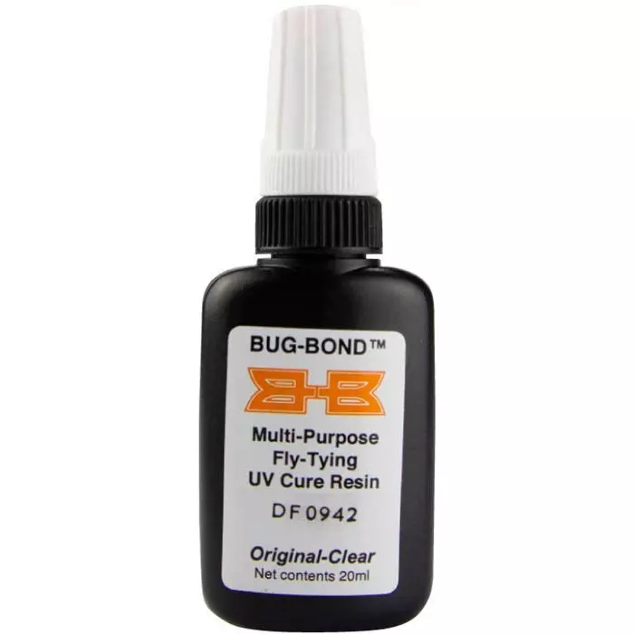 BUG-BOND (Original-Clear) is supplied with an applicator which allows you to apply small amounts and work this with a bodkin or a wooden tooth pick to get the desired effect on the item and then cure…this can take as little as 5 to 10 seconds. Large amounts of resin in saltwater baitfish patterns can take longer to cure BUT not as long or as inconvenient as using a drying wheel if using two part resins. A great feature of BugBond is that it will not to yellow on exposure to sunlight… in fact strong sunlight will deepen the cure further.