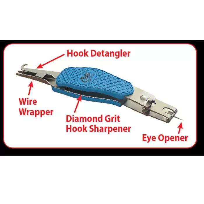 - Features integrated hook detangler, eye opener, wire wrapper & diamond grit hook sharpener.