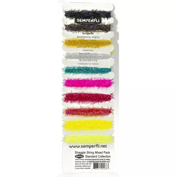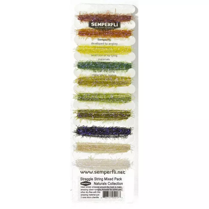 Straggle String is made of just 2 cores with a superb UV which looks like legs or adds that edge to thoraxes and legs on flies, from dries to wets and shrimps or bugs. As a substitute for peacock Straggle String can be used on Intruders, Salmon or Sea Trout flies equally well. Try two strands twisted together for superb effects.